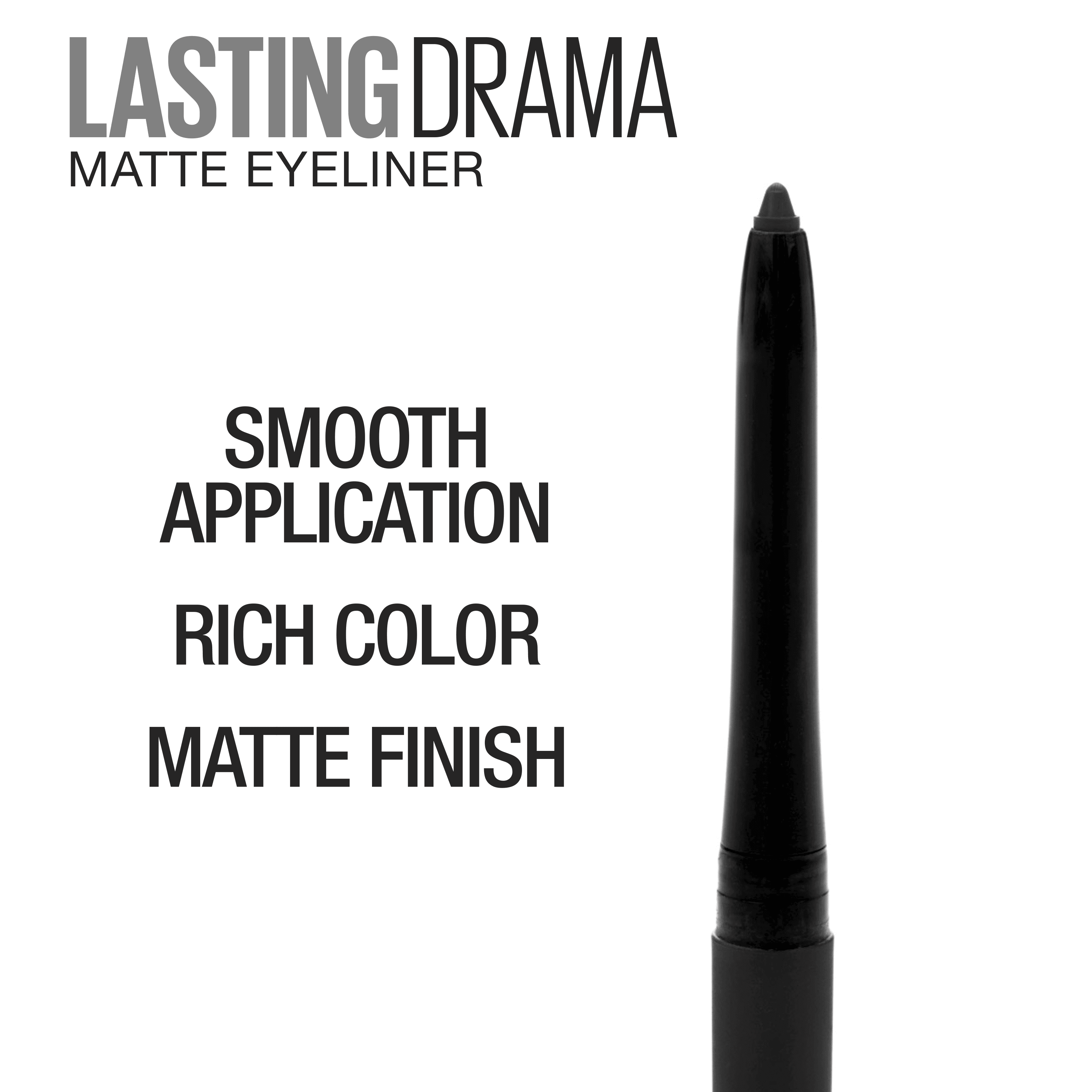 Maybelline Lasting Drama Matte Eyeliner Makeup, Jet Black Amp up your eye makeup with smoldering matte eyeliner color that lasts for 24 hours. This waterproof eyeliner pencil delivers rich, intense definition for bold looks that apply effortlessly and give a powder matte finish that lasts all day. Packaging May Vary. Rich color pigments and a creamy matte finish last for 24 hours for long-lasting, waterproof wear