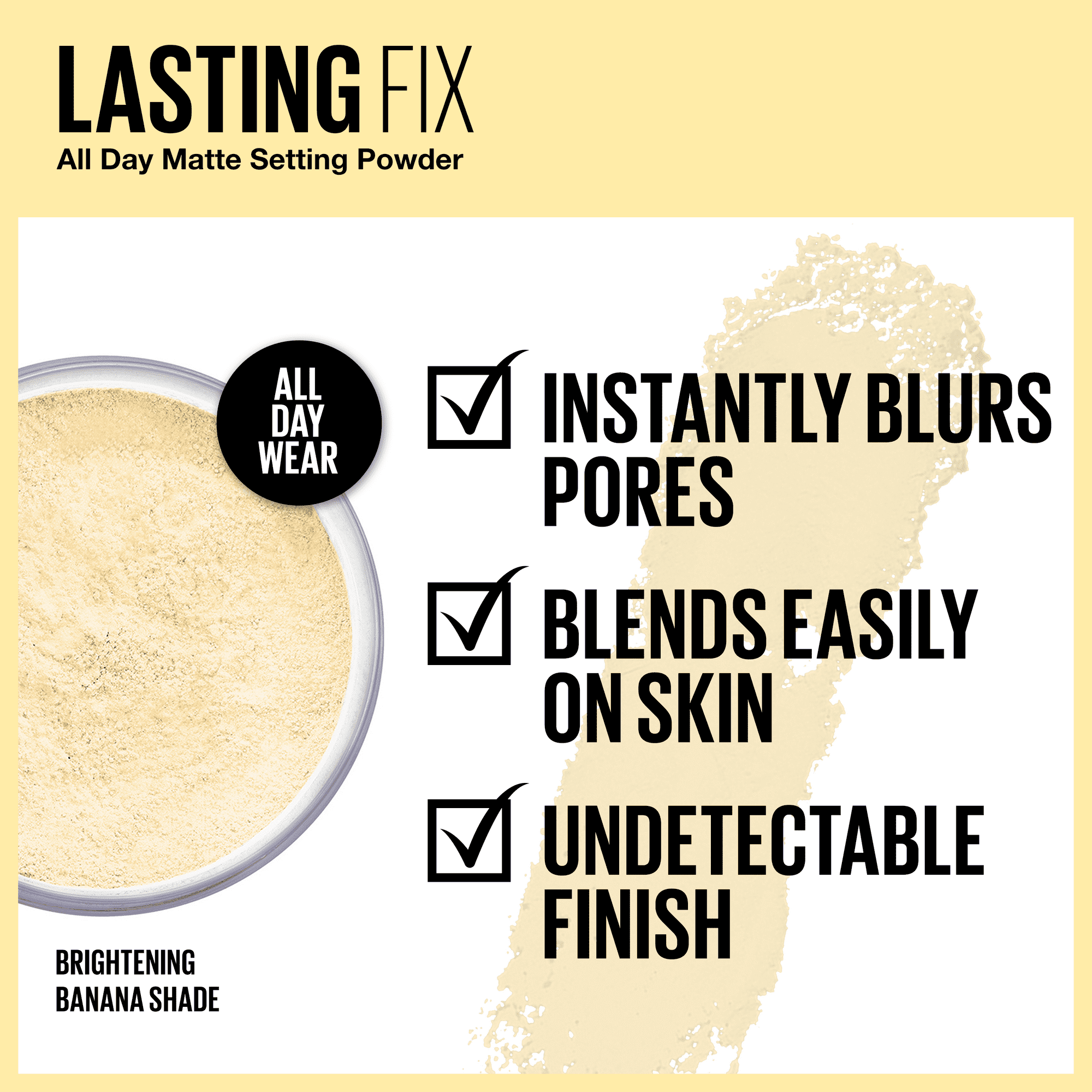 Maybelline Lasting Fix Banana Loose Setting Powder, Translucent, Set and perfect with an airbrushed look. Lasting Fix All Day Matte Setting Powder is now available in shade brightening Banana. Bring on serious staying power with this mattifying microfine powder that creates a soft focus effect as it sets makeup. This powder will keep your makeup locked down all day. Set your makeup look, achieve a matte finish, and minimize shine. This loose setting powder glides onto the skin, extending the wear of your foundation, while creating a flawless, matte finish that lasts. This multi-tasking powder is also your must-have essential for creating a perfectly baked and veiled makeup look.