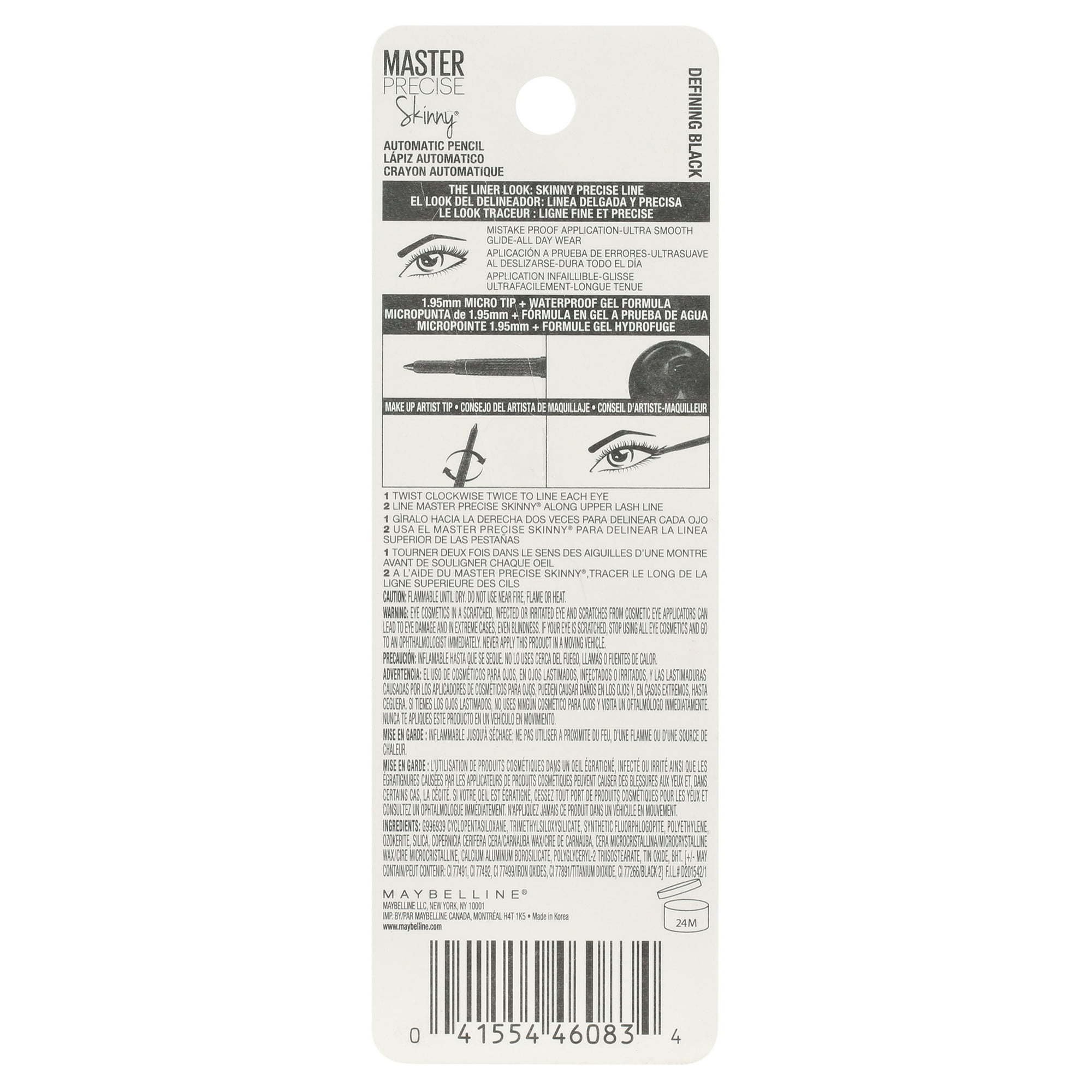 Maybelline Master Precise Skinny Gel Eyeliner Pencil, Defining Black, This automatic pencil delivers an ultra-smooth line that lasts all day. Achieve mistake-proof application thanks to the 1.8mm micro-tip and smooth gel intensity. This automatic pencil delivers an ultra-smooth line that lasts all day. Achieve mistake-proof application thanks to the 1.8mm micro-tip and smooth gel intensity. Twist-up automatic gel pencil with a precision micro-tip Master the most precise eye looks with this always sharp gel eyeliner Available in 3 defining shades All day wear Twist clockwise twice to line each eye. Line along the upper lash line. Eyeliner is easily removed with Maybelline Expert Eyes 100% Oil-Free Eye Makeup Remover. Caution: Flammable until dry.
