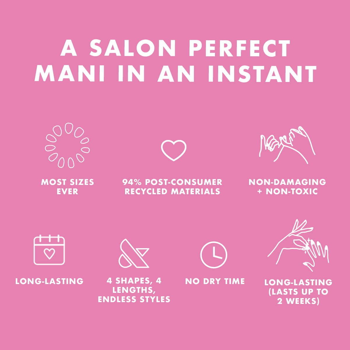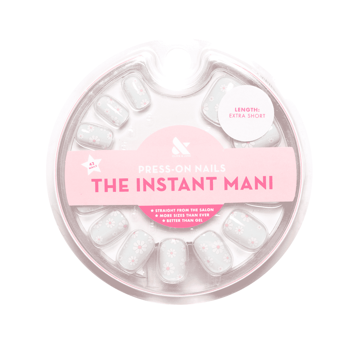 Meet the realest-looking fake nails you've ever seen. The Instant Mani by Olive & June are press-on nails that come in 21 sizes (the most ever!) with the realest-looking fit. Each package contains 42 total nails and everything you need for a perfect press-on mani at home. Straight from the salon, better than gel. Lasts 7 days thanks to non-toxic and non-damaging glue. Fake nails never looked so real.